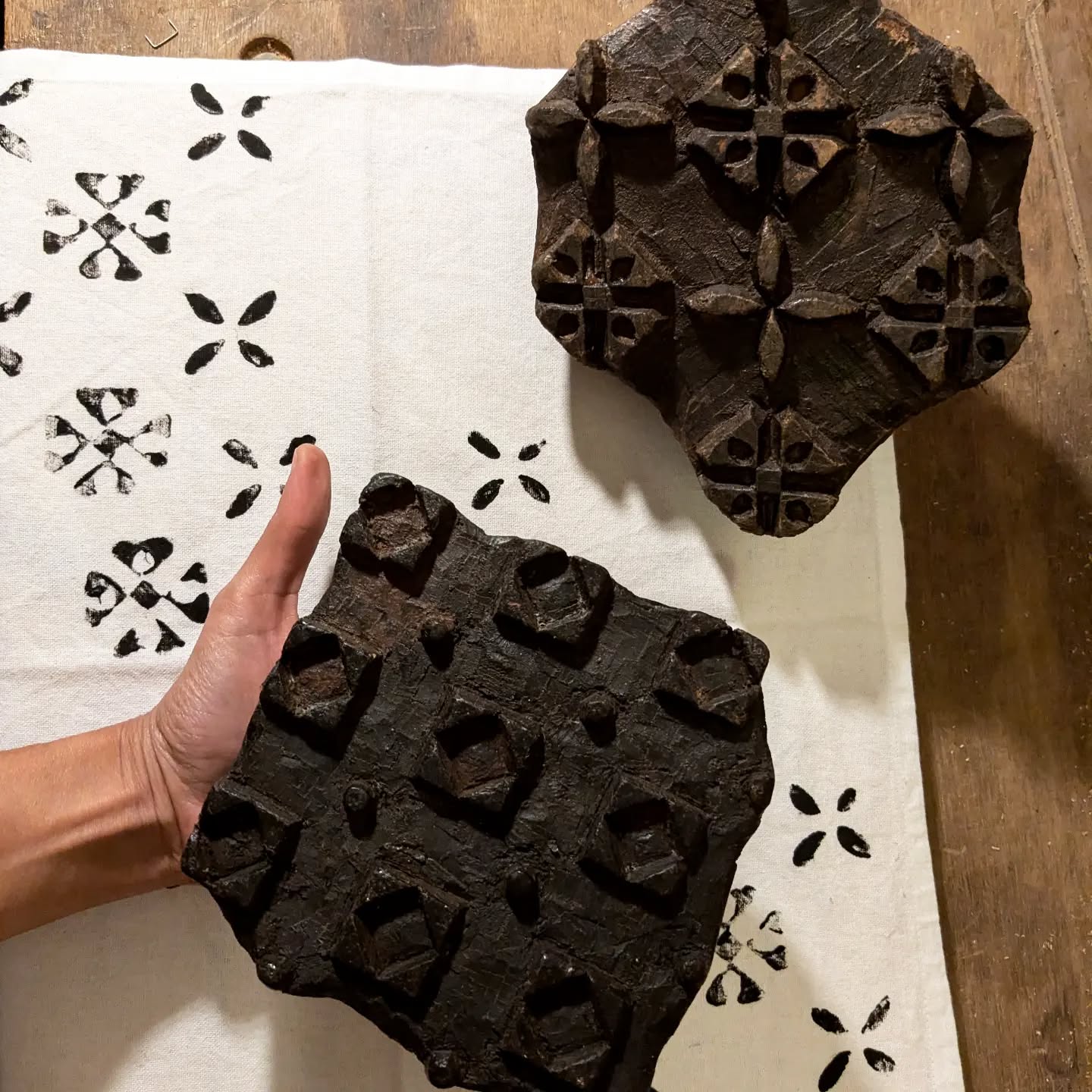 Chaque motif est imprimé à la main sur tissu, selon une méthode artisanale inspirée des techniques traditionnelles africaines et asiatiques. Les encres pénètrent la fibre, révélant des textures subtiles et des nuances uniques. Chaque impression devient une pièce singulière, empreinte du geste, du temps et de la matière.